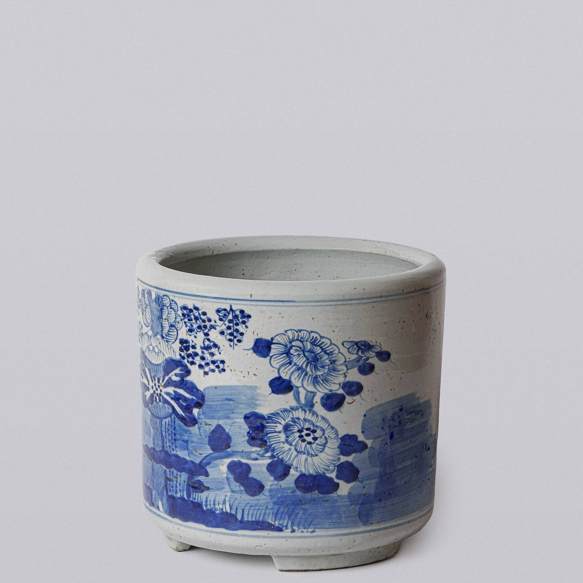 This blue and white porcelain vessels from the antiques markets of Jingdezhen, a town long distinguished by imperial patronage, is a hand painted, wheel thrown rustic porcelain cachepot featuring a traditional decorative four seasons pattern depicting lotus, peony, and chrysanthemum. 9 3/4” x 9 1/2”