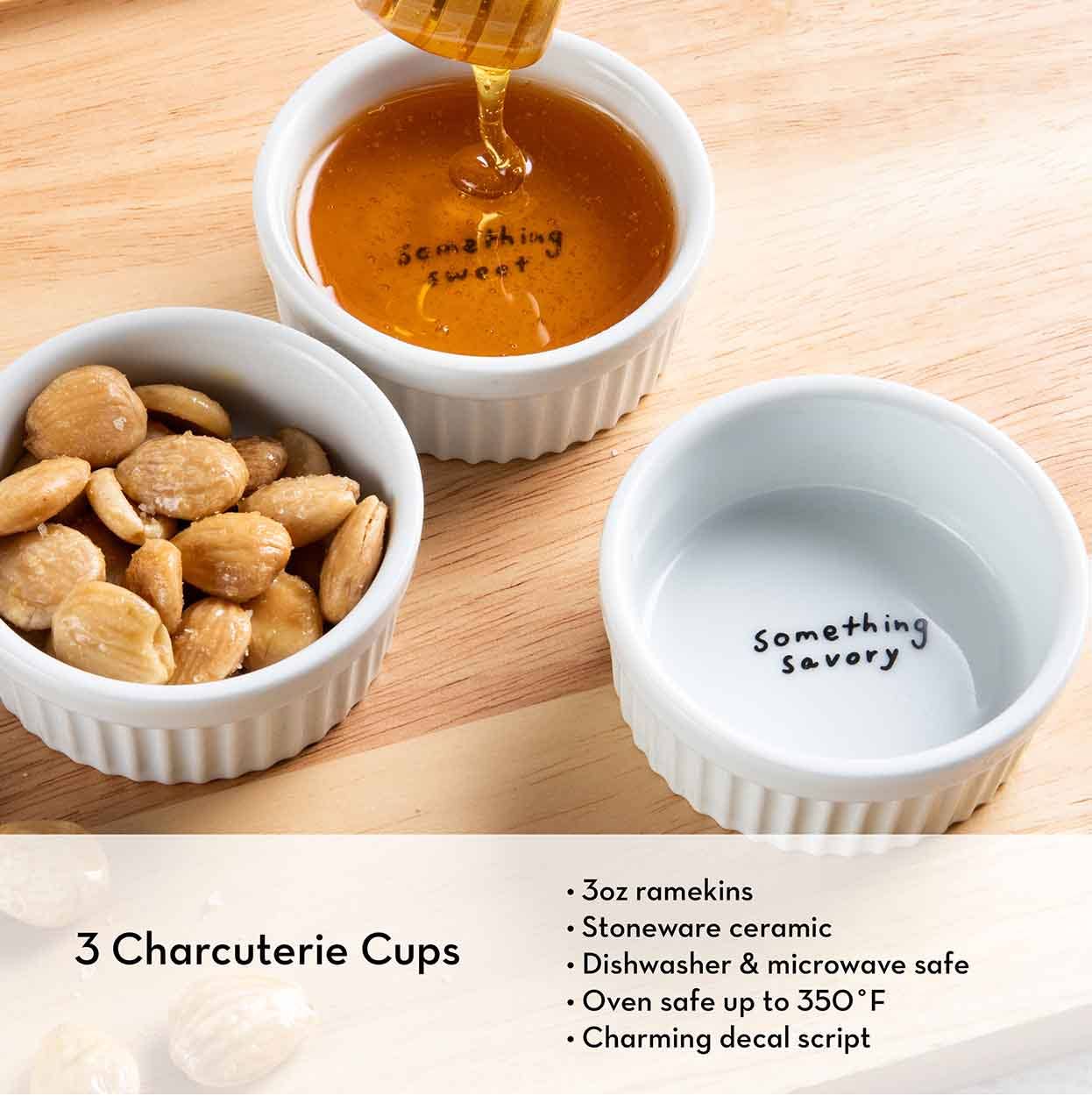 Three Large Ceramic Ramekins: These 3oz, stoneware ceramic ramekins have a glazed finish and are dishwasher, microwave, and oven safe up to 350 degrees. They feature charming decal words on the bottom, labeled 'something savory', 'something crunchy', and 'something sweet.'