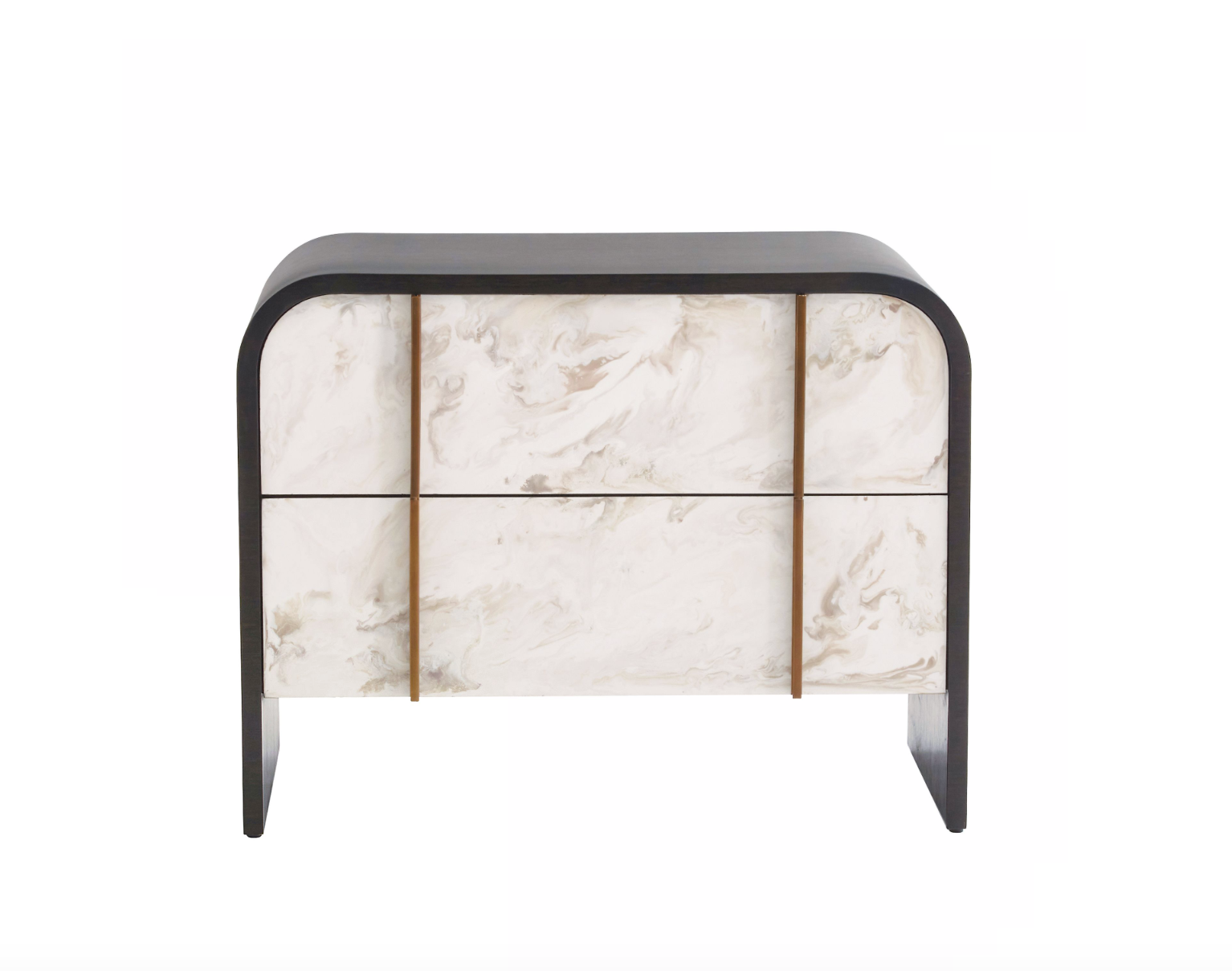 This end table effortlessly balances contemporary design and classic style with a rich combination of finishes and detail. The waterfall construction features a hand-applied faux marble facade that is crafted of resin in a cloud finish and framed by oak veneer in ebony. A vintage brass trims the frame for an added element of elegance, while I-beam hardware makes this piece functional.